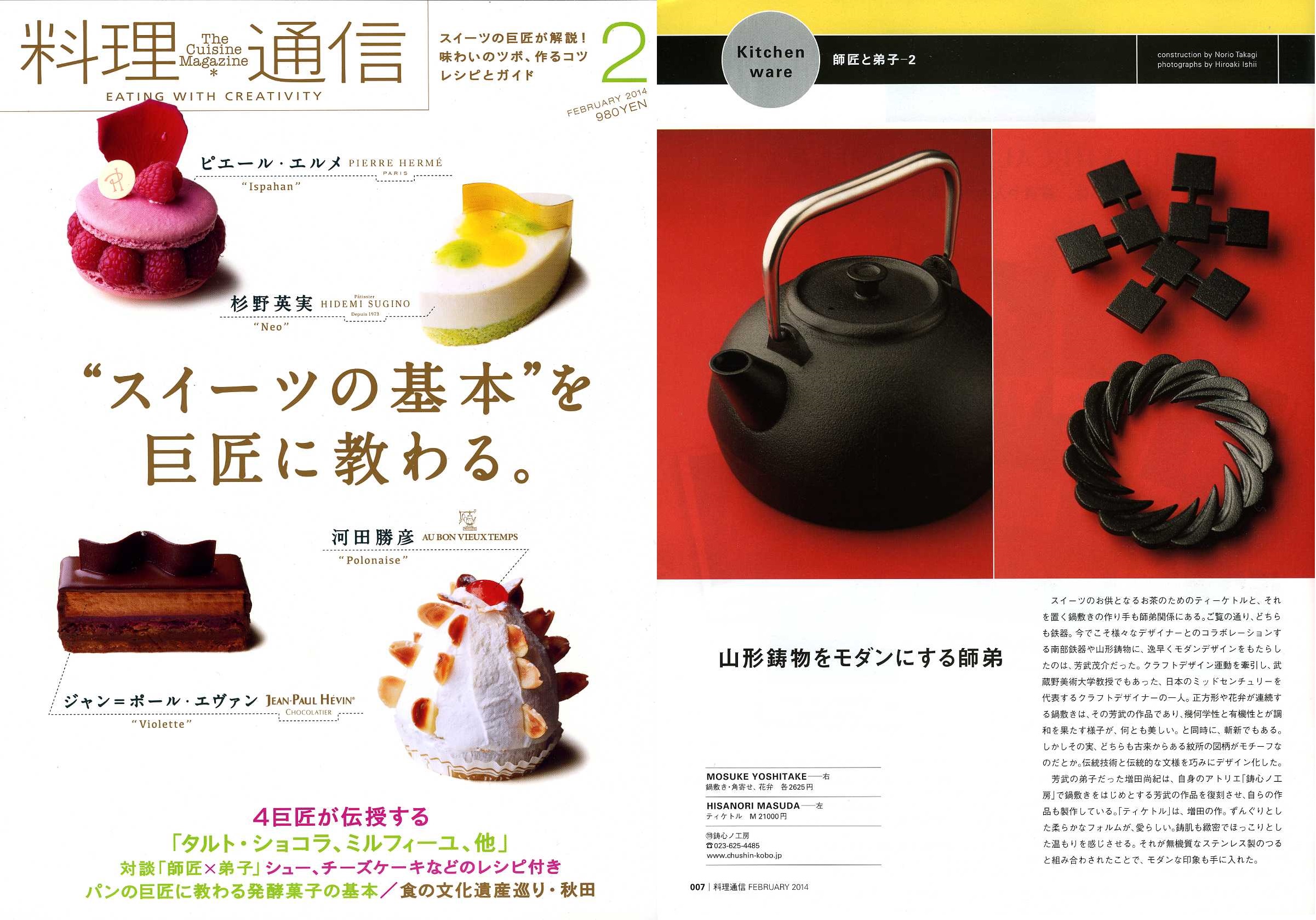 「山形鋳物をモダンにする師弟」という内容で、芳武茂介先生の鍋敷き・角寄せ、花弁と増田尚紀のティケトルが紹介されました。芳武先生のプロフィール、鋳心ノ工房の取り組みも紹介されています。