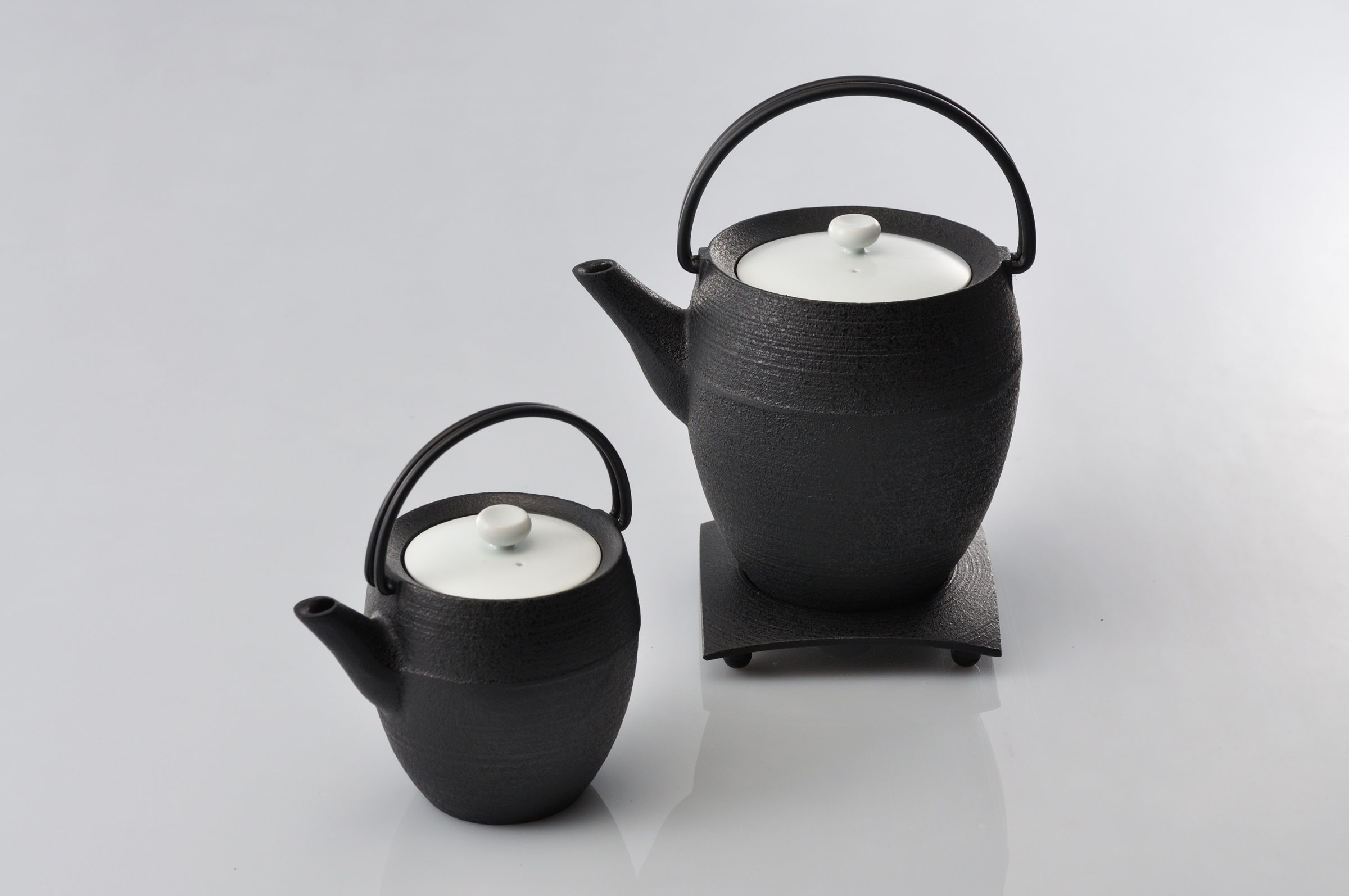 鉄鋳物の本体と磁器の蓋とを組み合わせた異なる素材を用いたティポットです。この組み合わせは、古くから茶道具の組み合わせの一つで、懐石料理の重要な器、燗鍋に使われていました。今回のデザインは、新利休スタイルと名付け、現代の茶道具としての提案です。蓋は有田焼の磁器でつくられています。白、黒のモノトーンと手書きによる上絵の赤、青を独楽筋の文様として表現した4種類のデザインです。ティポットは丸筒、丸玉、平つぼの大小6種類の本体に、蓋は好みに合わせて組み合わせて使うことができます。日本の伝統的な茶道具の歴史をベースに新しいお茶のスタイルを提案するシリーズです。