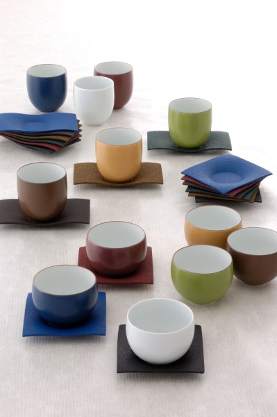 鋳物の茶托と磁器の湯呑シリーズです。 ソーサー(茶托)は、やさしい曲面と砂肌を生かしたテクスチャーが美しい茶托です。デザインは、四角と 長角の2種類です。ティカップ(湯呑)は、まるとだえんの2種類のデザインです。手のひらに納まる掌(たなごころ)のかたちです。内側が白色ですので各種 類のお茶の色を楽しめます。 四角のソーサーには、まるのティカップを、長角のソーサーには、だえんのティカップが似合います。色は黒・緑・青・ 茶・黄・濃茶の6色です。ソーサー、ティカップの色を様々に組み合せてお使いください。またティポットの色も合せれば、さらに楽しくカラーコーディネイト できます。