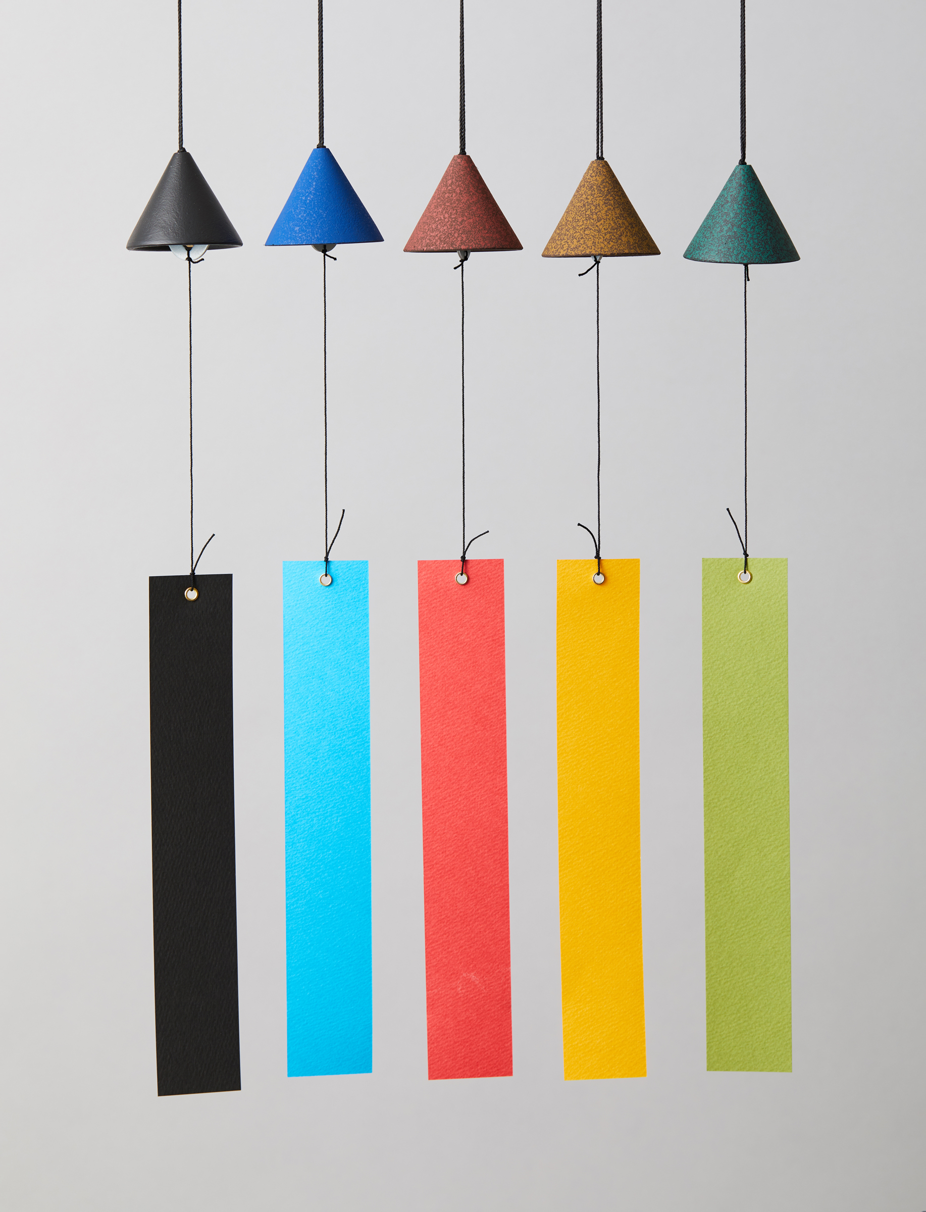 風鈴は古い塔堂伽藍の軒裏の隅々に吊るされていた風鐸が起源ともいわれています。 鈴の呼び名はその鈴の音色の清(すず)しさから生まれました。その清らかな音色には、心を鎮め、魔を払う呪力があると信じられ、弥生時代の出土品で使途の明らかでない銅鐸も祭具として使われた鐘の一種であると知られています。 山形らしい今日の時代に合う、デザイン性の高い風鈴の開発が鋳心ノ工房によってスタートしたのは1990年。日本の美を代表する折り紙をモティーフに始められ、10種類のシンプルなデザインが黒色で展開されました。 その後1995年から青、緑、茶、黄、黒の5色で彩色シリーズがスタート。現在は吊り型スタイルのほか、テーブル置きスタイルも展開しています。 今回紹介します吊り風鈴は、室内用の置型風鈴です。部屋の中のエアコン、扇風機の風で音色を楽しんで下さい。トレーに大切な小物を入れることもできます。また玄関先に置き、トレーに鍵を入れて、カギの出し入れで短冊に手が触れ、風鈴が鳴る。そんな楽しみ方もあります。