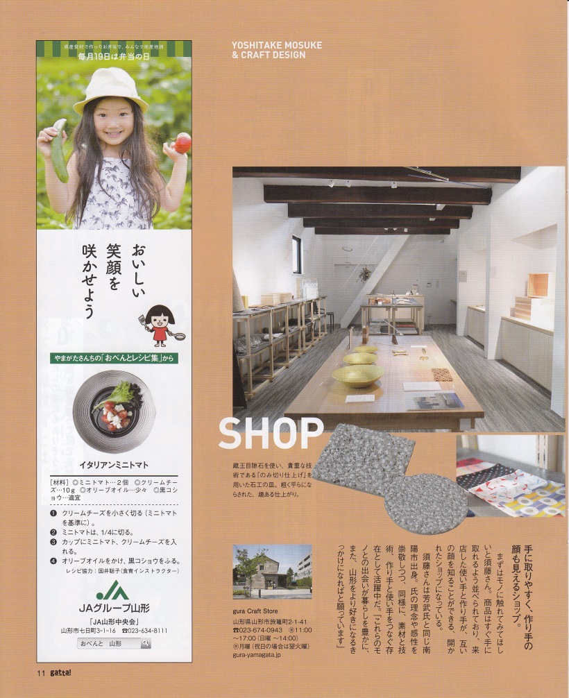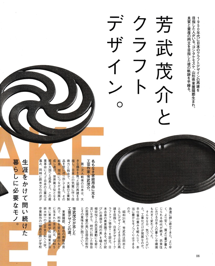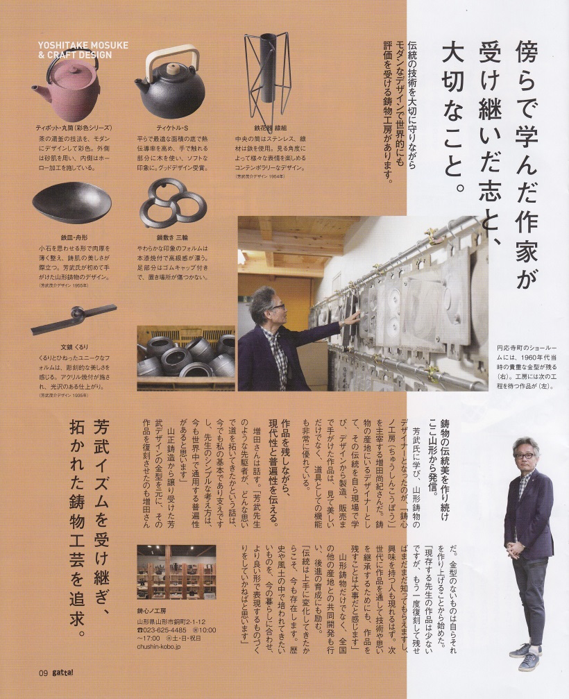 山形のフリーマガジンgatta! vol.165の特集企画で芳武茂介とクラフトデザインが8ページにわたり掲載されました。P9には鋳心ノ工房で復刻した芳武の作品も紹介されています。