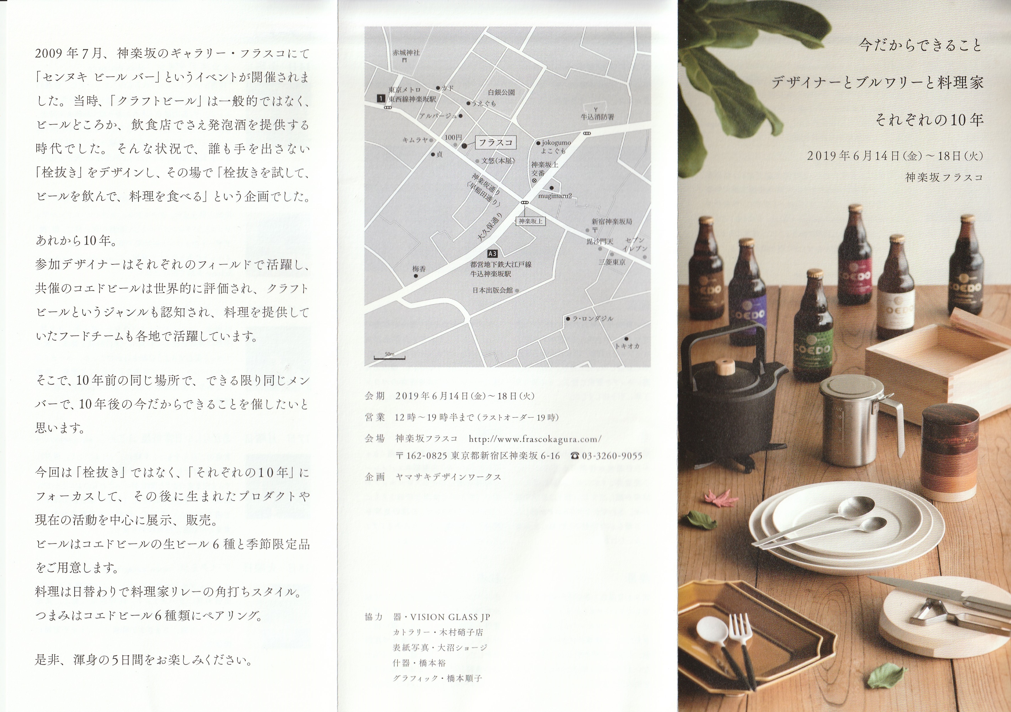 2009年7月神楽坂のフラスコで「センヌキビールバー」展が開催されてから10年経過しました。あれから10年、再び6名の同じメンバーと同じ場所で展示会をすることになりました。今回もモノを展示するに留まらず、ビールとフードも会場でお楽しみいただけます。企画はヤマサキデザインワークスです。