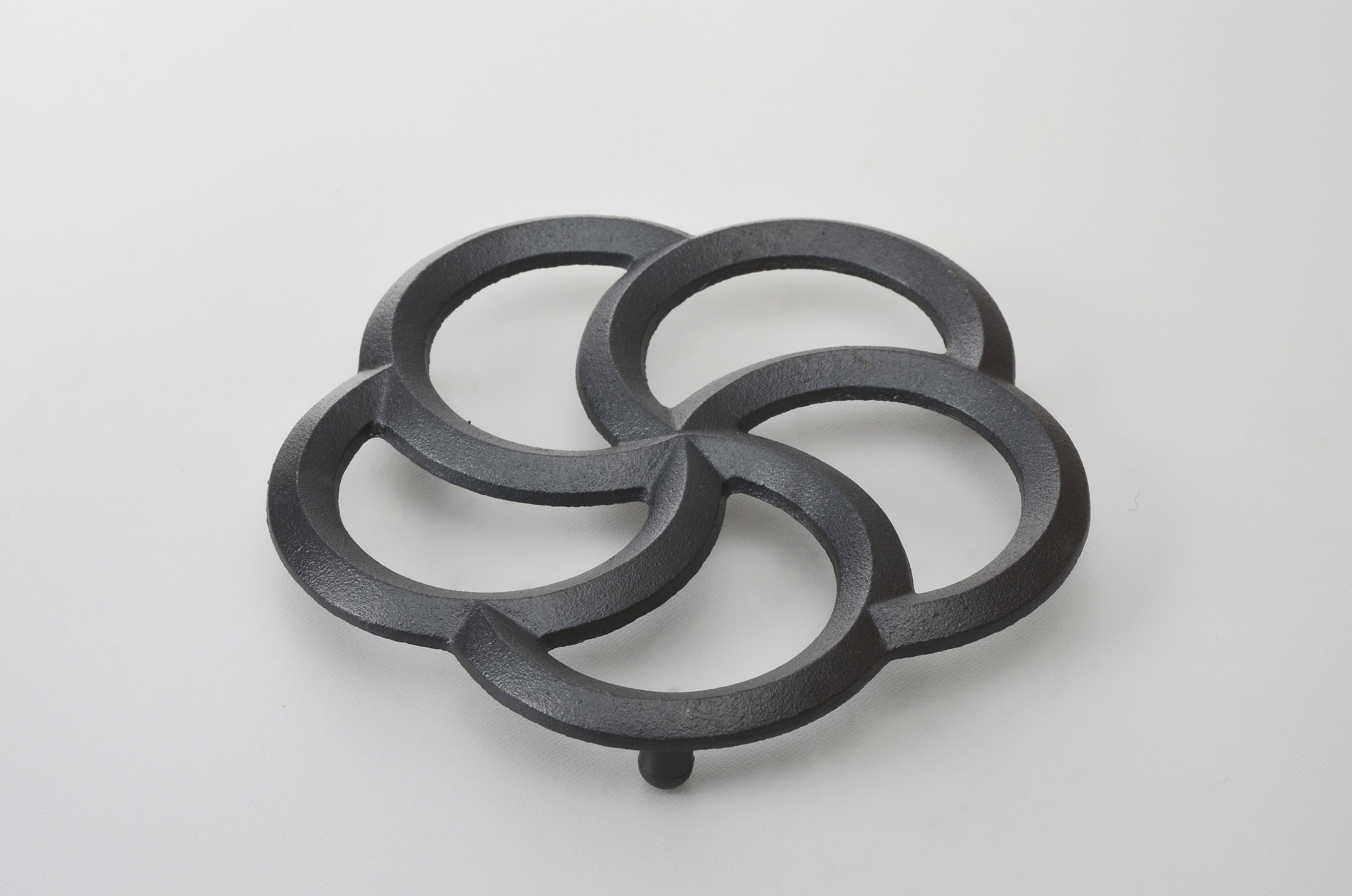 品番:CH-98品名:鍋敷・五輪色:黒(本漆焼付仕上げ)寸法:170x165x25mm材質:鋳鉄重量:500g価格:5,000円(税抜き)