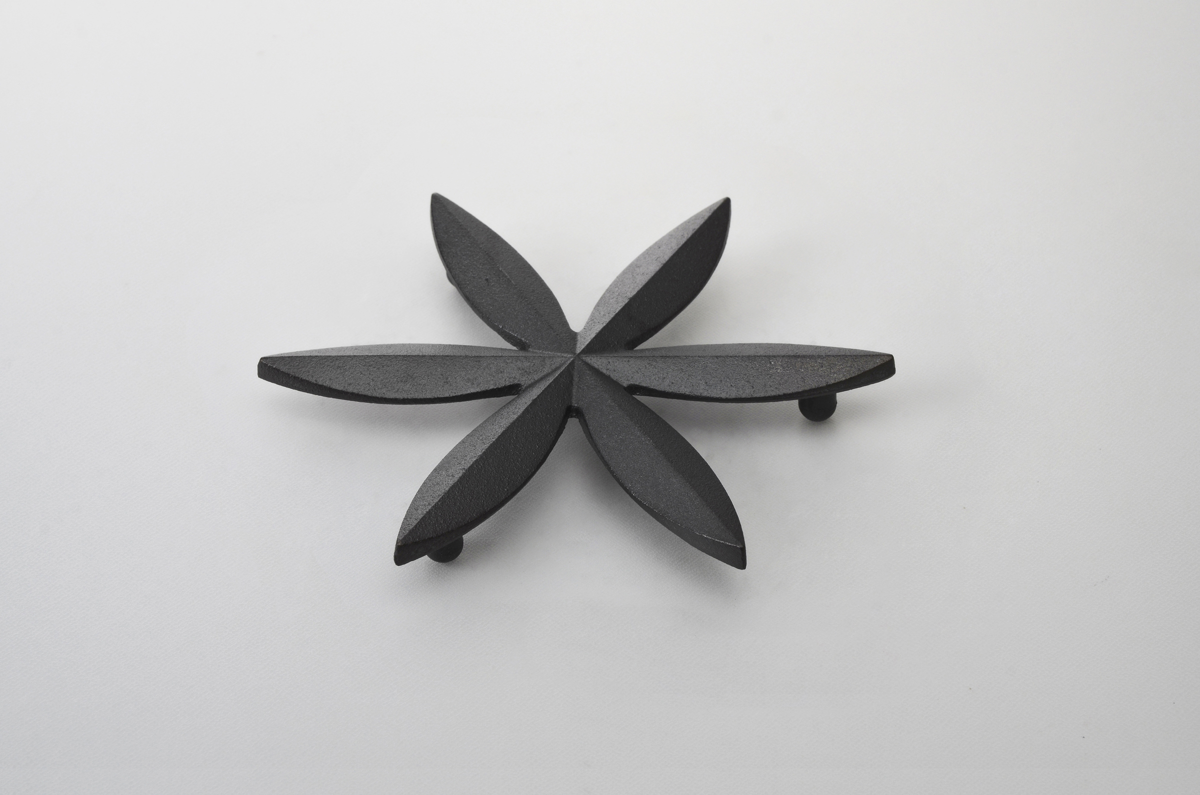 品番:CH-27S 品名:鍋敷・笹車・S色:黒(本漆焼付仕上げ)寸法:135x120x15mm材質:鋳鉄重量:220g価格:3,000円(税抜き)