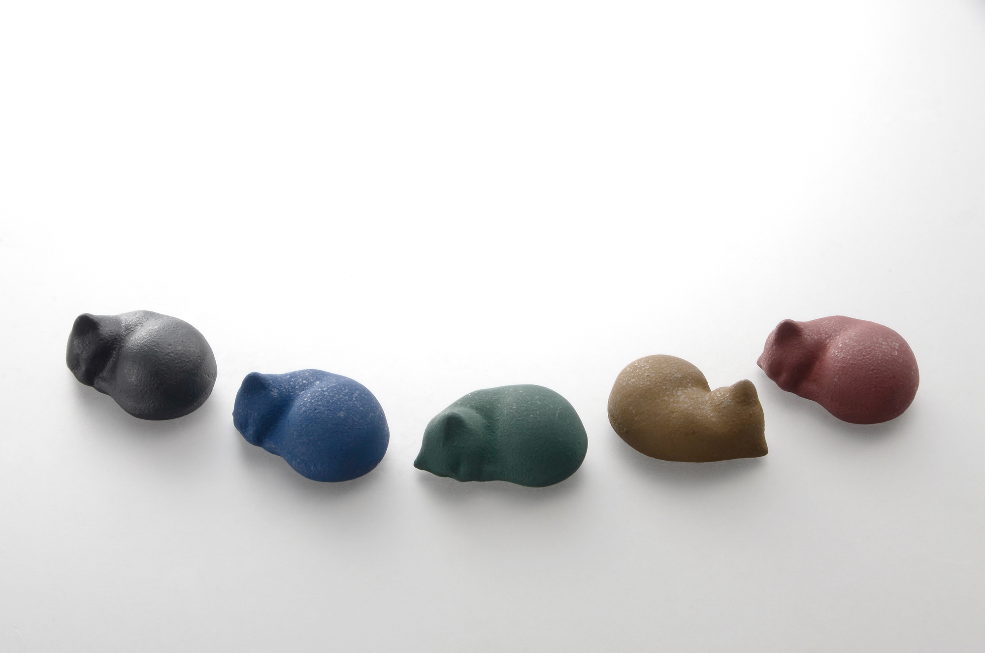 品番:NK-01品名:ペーパーウェイト・ネムリネコ・S色:黒・青・緑・黄・茶寸法:W48xD34xH21mm材質:鋳鉄重量:約130g価格:1,800円(税抜)