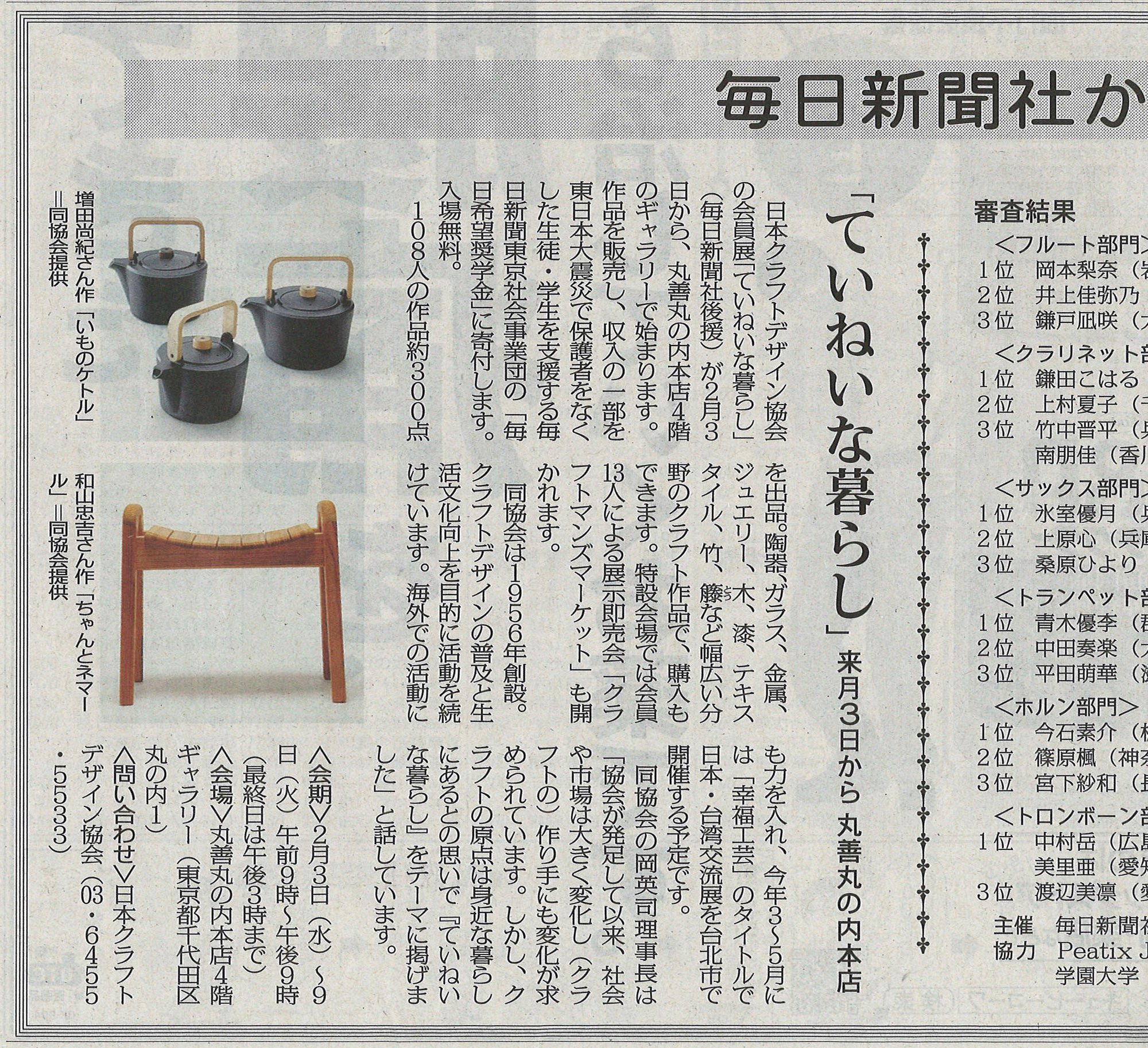 日本クラフトデザイン協会は、クラフト分野で唯一の公益社団法人です。日本各地で活躍する会員は、陶磁、ガラス、金属、ジュエリー、木、漆、テキスタイル、竹、藤など幅広い素材と分野で作品を作り続けています。私たちはこの1年間、新型コロナウィルス感染症の影響もあり、大切な「もの」や「こと」を改めて考えました。今こそ、身近な人たちとの日々を丁寧に過ごすために、作家が心を込めて生み出したクラフト作品の出番です。作家の手から使い手である皆様の手へ。協会108名の作家による「ていねいな暮らし」の道具をご覧ください。なお、この展覧会の売り上げの一部を「毎日希望奨学金」に寄付します。