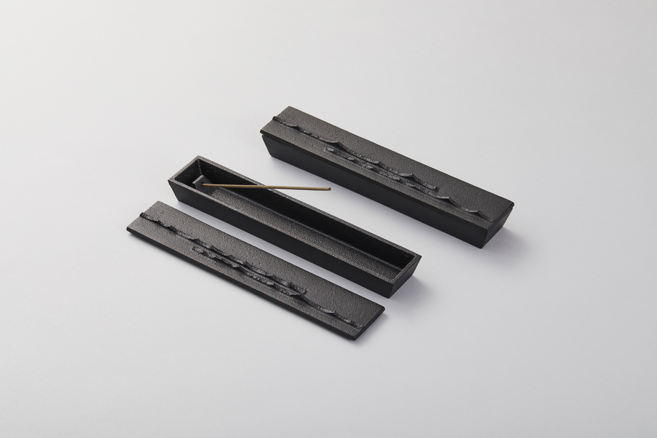 This incense box is designed with consideration for incense ash. The incense is placed at an angle in the holder. The ash falls into the incense box, so it is safe to use and does not stain the surrounding area. The cast iron lid has a technique called Haochi, which is handed down from a traditional tea ceremony pot. All shapes are different because each one is hit with a hammer to form a mountain range.