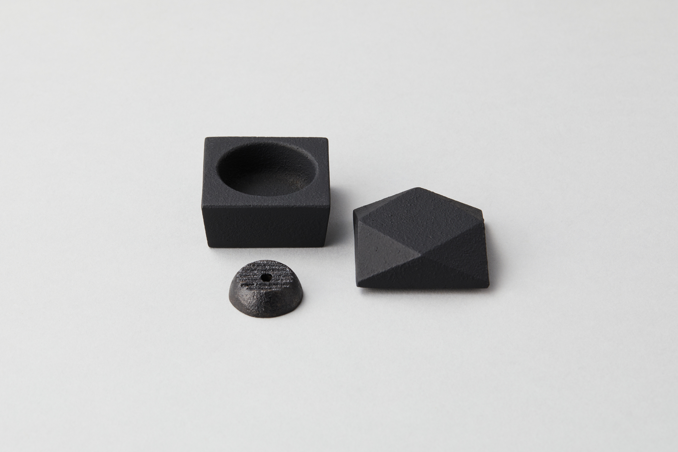 Three shapes were created by cutting a square prism. A two-folded angle with a diagonal cut, a four-folded angle with four corners cut, and an eight-folded angle with eight sections. This incense box is designed to pursue the beauty of its cut surfaces. Remove the lid and