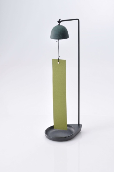 室内用の置型風鈴です。部屋の中のエアコン、扇風機の風で音色を楽しんで下さい。トレーに大切な小物を入れることもできます。また玄関先に置き、トレーに鍵を入れて、カギの出し入れで短冊に手が触れ、風鈴が鳴る。そんな楽しみ方もあります。全5色(青、緑、茶、黄、黒)
