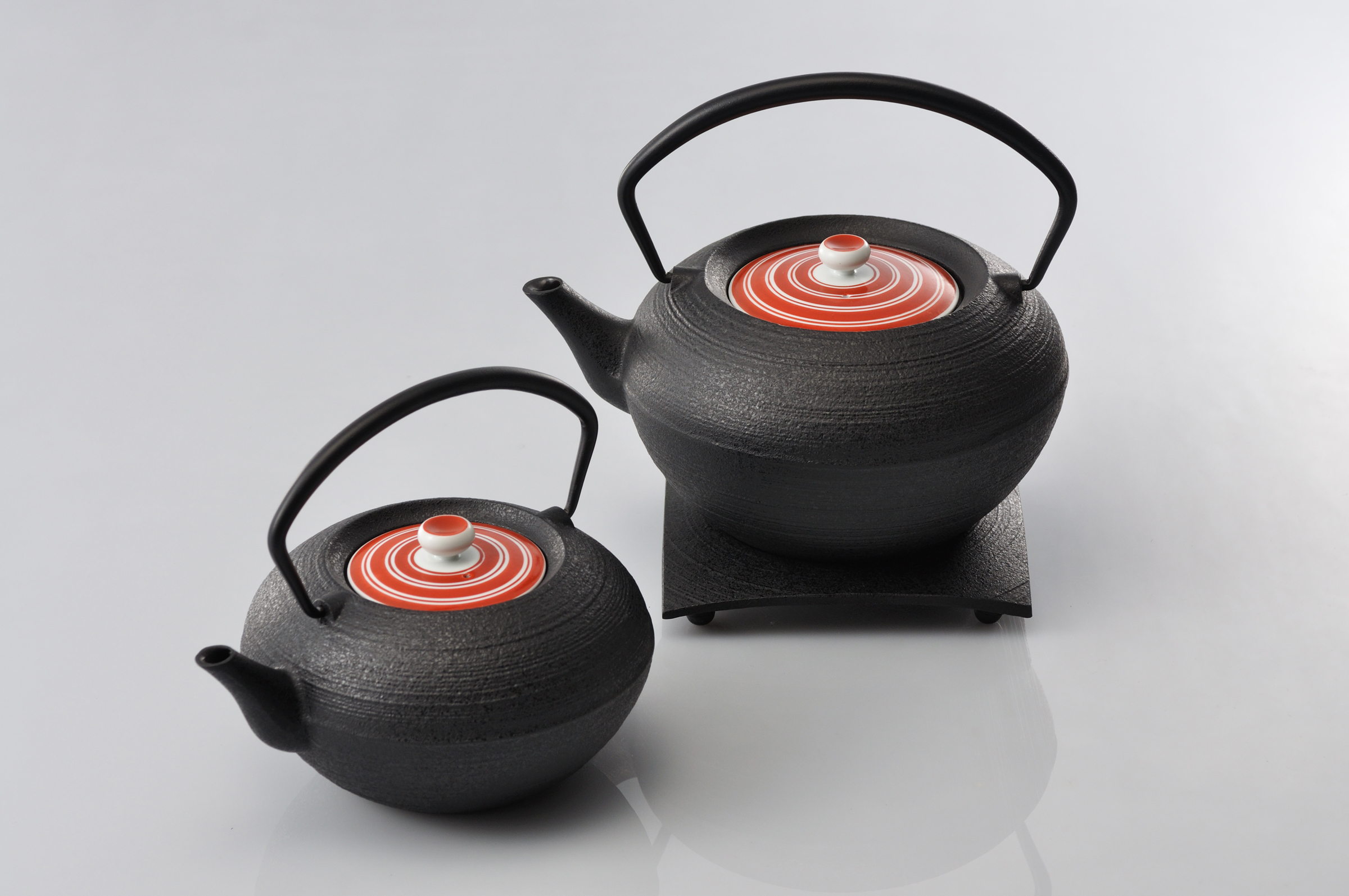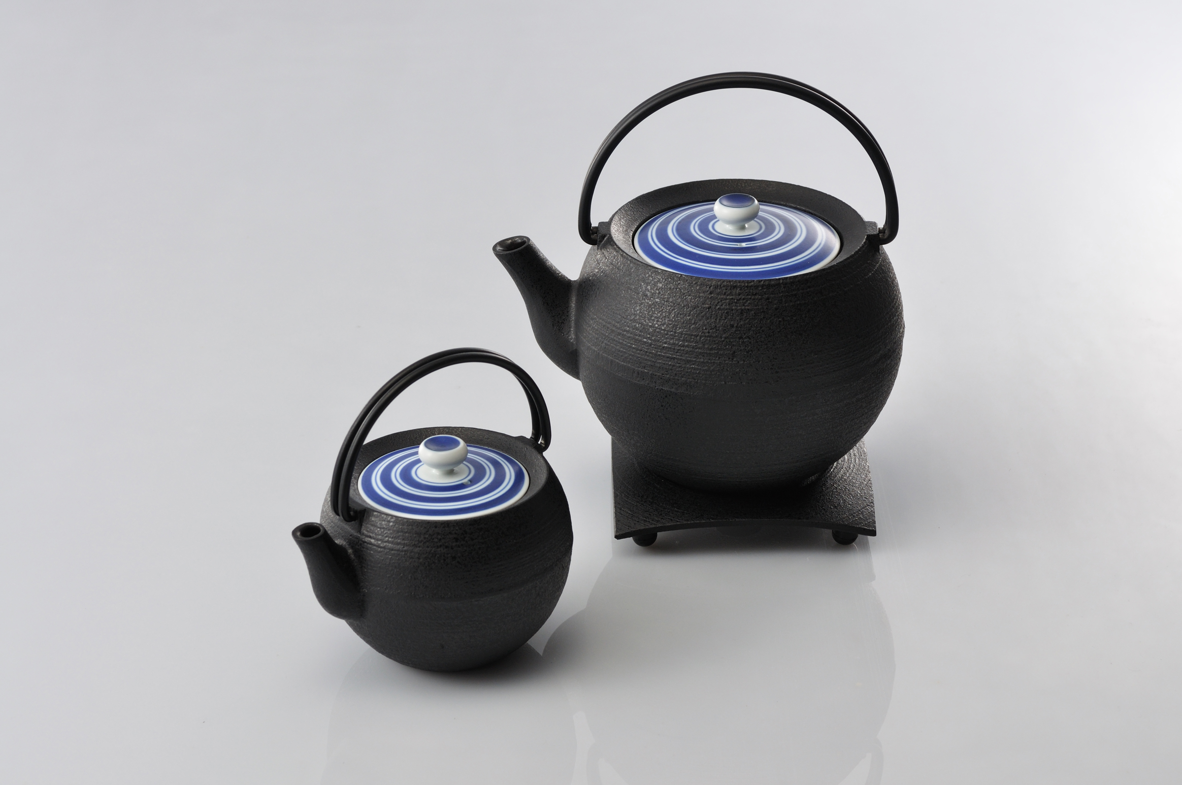 鉄鋳物の本体と磁器の蓋とを組み合わせた異なる素材を用いたティポットです。この組み合わせは、古くから茶道具の組み合わせの一つで、懐石料理の重要な器、燗鍋に使われていました。今回のデザインは、新利休スタイルと名付け、現代の茶道具としての提案です。蓋は有田焼の磁器でつくられています。白、黒のモノトーンと手書きによる上絵の赤、青を独楽筋の文様として表現した4種類のデザインです。ティポットは丸筒、丸玉、平つぼの大小6種類の本体に、蓋は好みに合わせて組み合わせて使うことができます。日本の伝統的な茶道具の歴史をベースに新しいお茶のスタイルを提案するシリーズです。