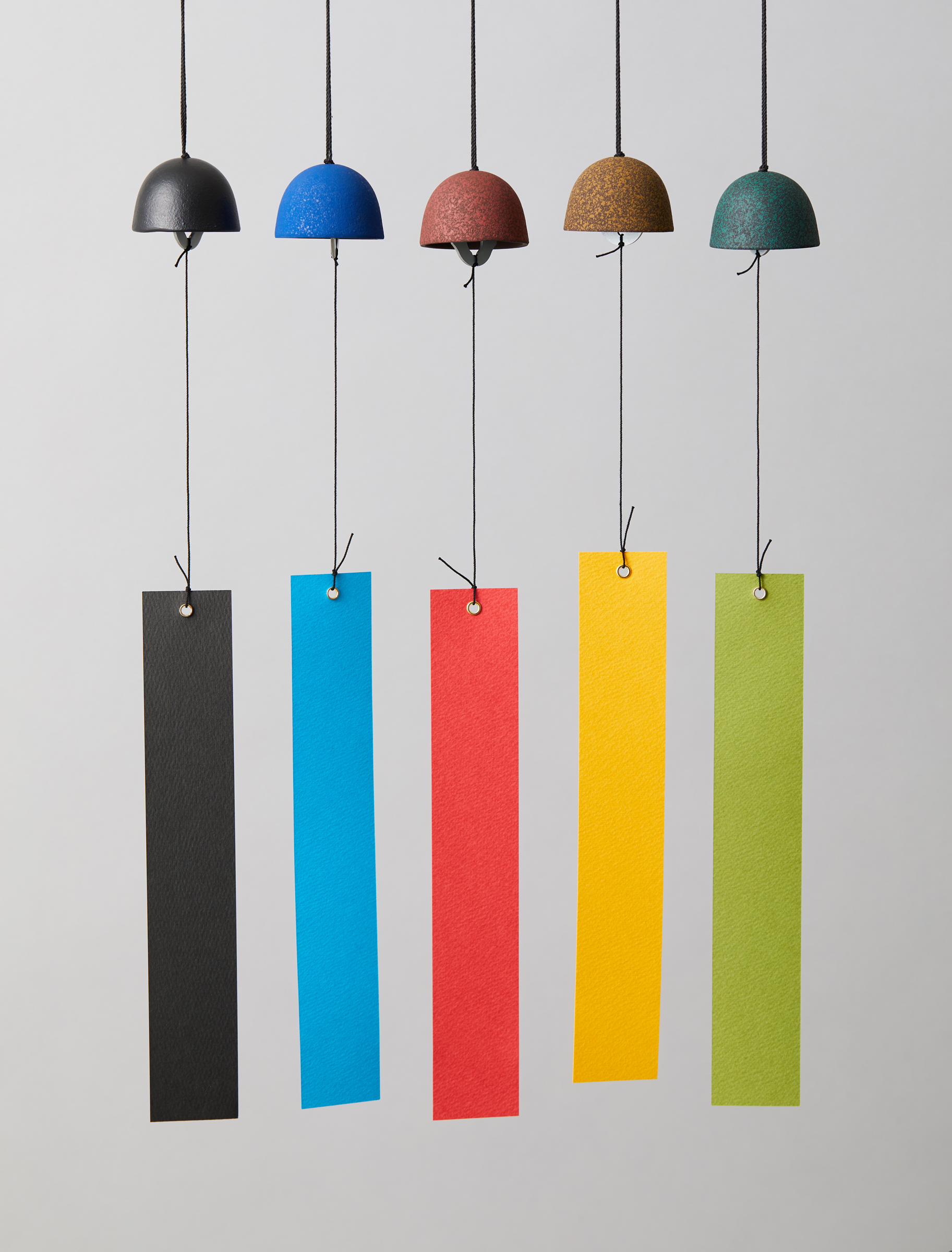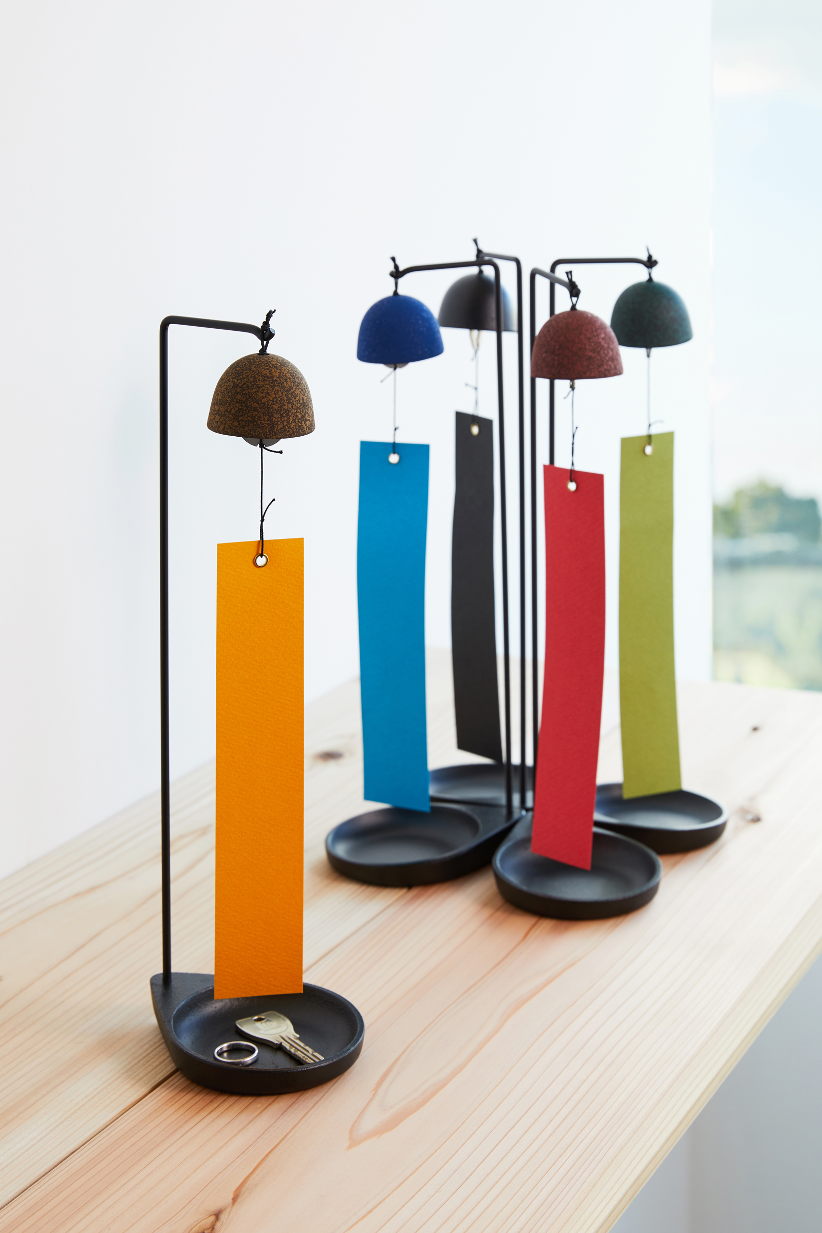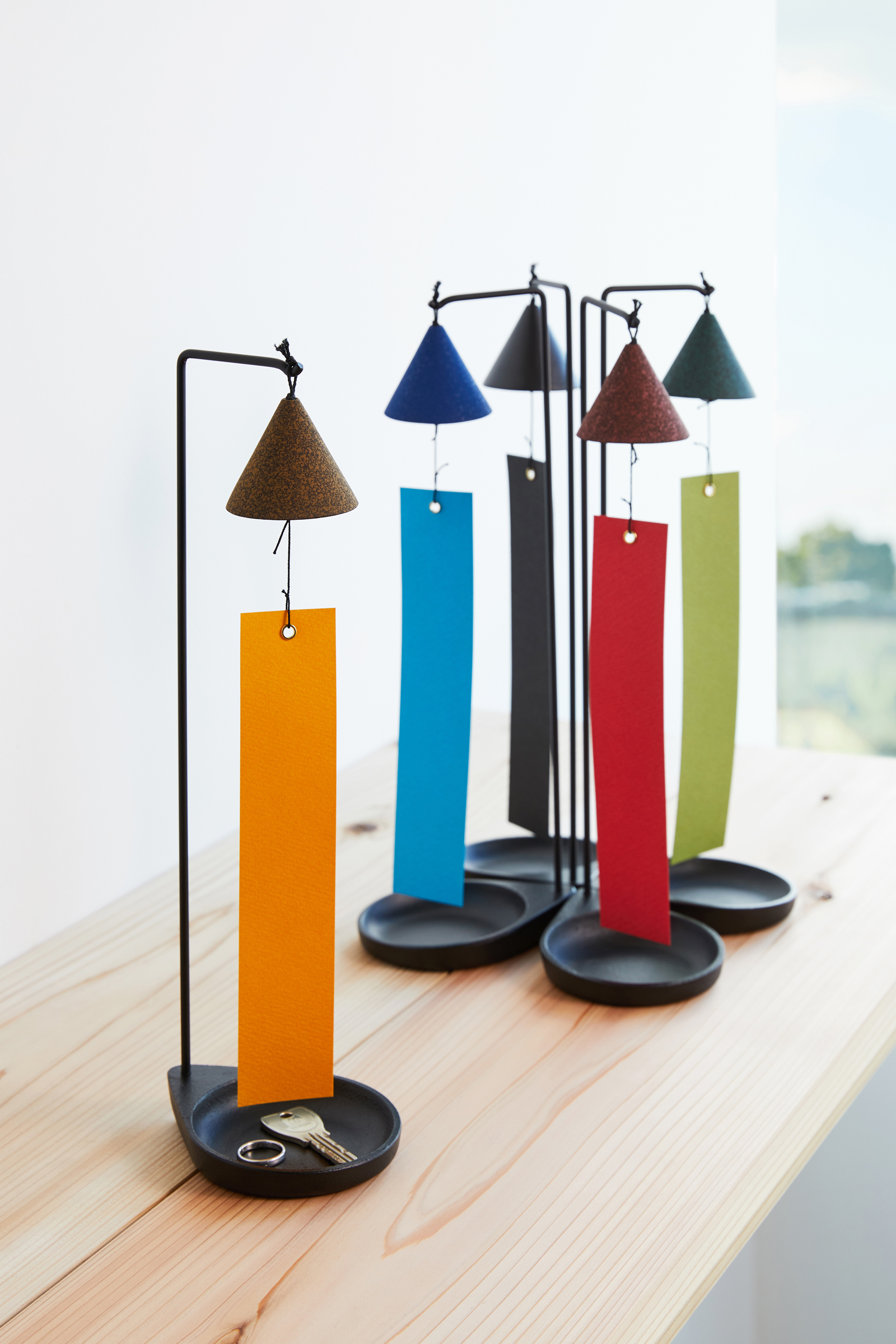 風鈴は古い塔堂伽藍の軒裏の隅々に吊るされていた風鐸が起源ともいわれています。 鈴の呼び名はその鈴の音色の清(すず)しさから生まれました。その清らかな音色には、心を鎮め、魔を払う呪力があると信じられ、弥生時代の出土品で使途の明らかでない銅鐸も祭具として使われた鐘の一種であると知られています。 山形らしい今日の時代に合う、デザイン性の高い風鈴の開発が鋳心ノ工房によってスタートしたのは1990年。日本の美を代表する折り紙をモティーフに始められ、10種類のシンプルなデザインが黒色で展開されました。 その後1995年から青、緑、茶、黄、黒の5色で彩色シリーズがスタート。現在は吊り型スタイルのほか、テーブル置きスタイルも展開しています。 今回紹介します吊り風鈴は、室内用の置型風鈴です。部屋の中のエアコン、扇風機の風で音色を楽しんで下さい。トレーに大切な小物を入れることもできます。また玄関先に置き、トレーに鍵を入れて、カギの出し入れで短冊に手が触れ、風鈴が鳴る。そんな楽しみ方もあります。