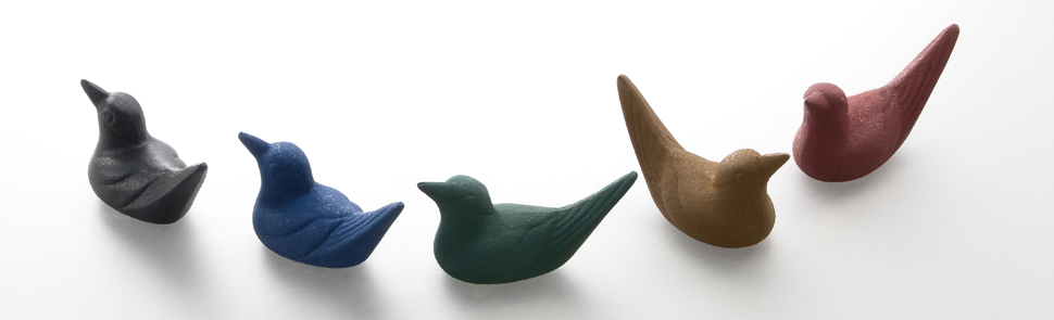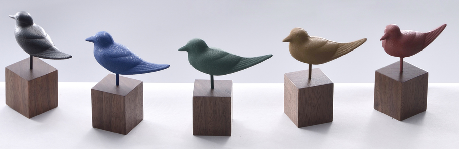 今回の展示は、“small beautiful world”のタイトル通りに、小さな砂型鋳物の世界を表現した作品を展示します。鳥シリーズのオーナメントは、8種類のデザインと5色カラーの小さな鋳物の鳥たちです。机の上、棚の片隅の空間に素敵なアクセントになり、部屋の雰囲気を変えるオーナメントです。