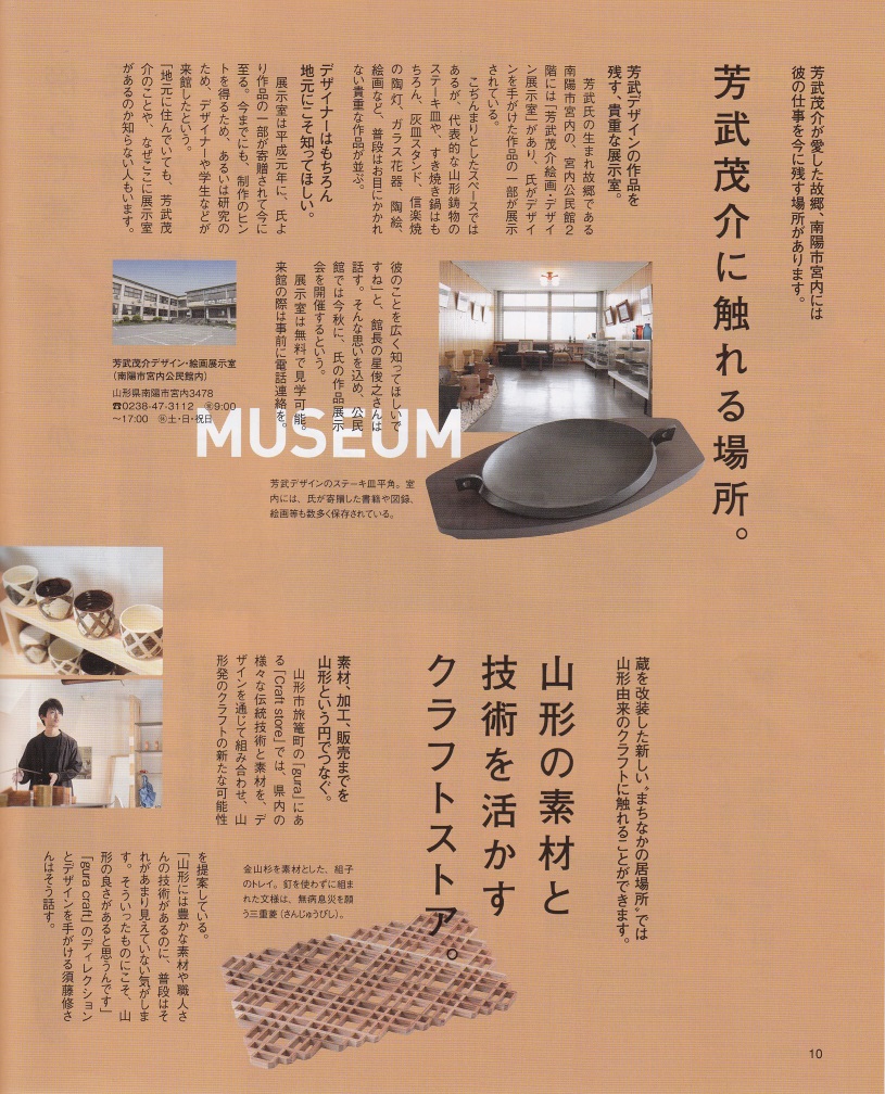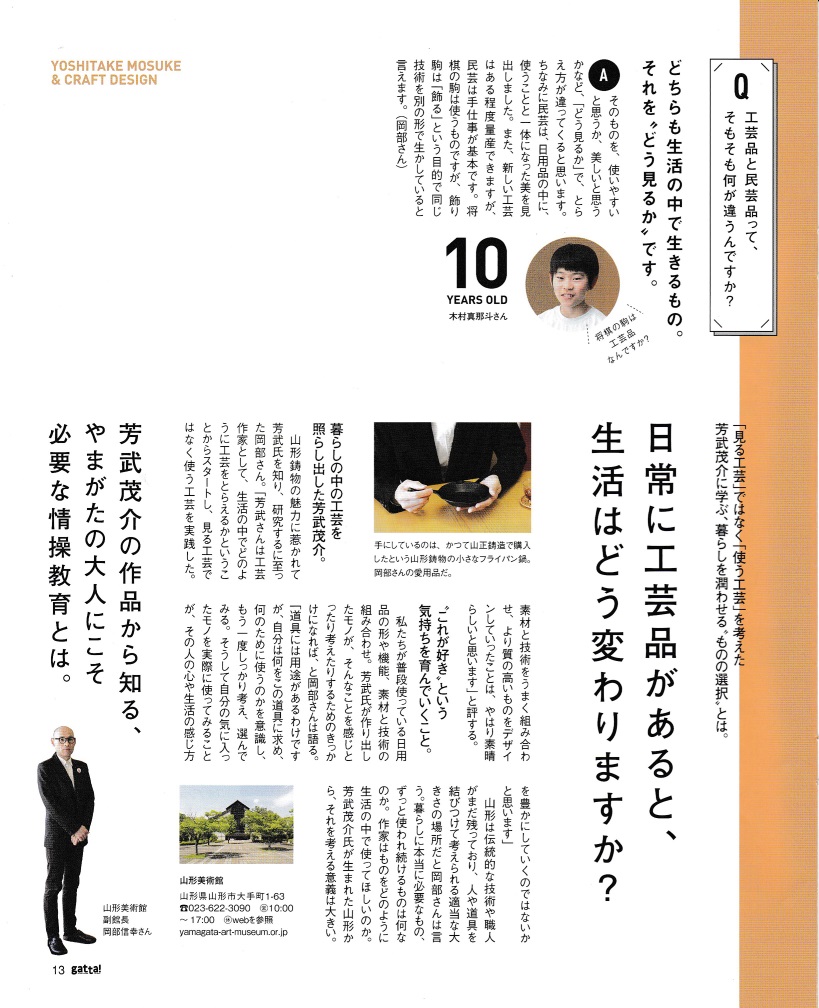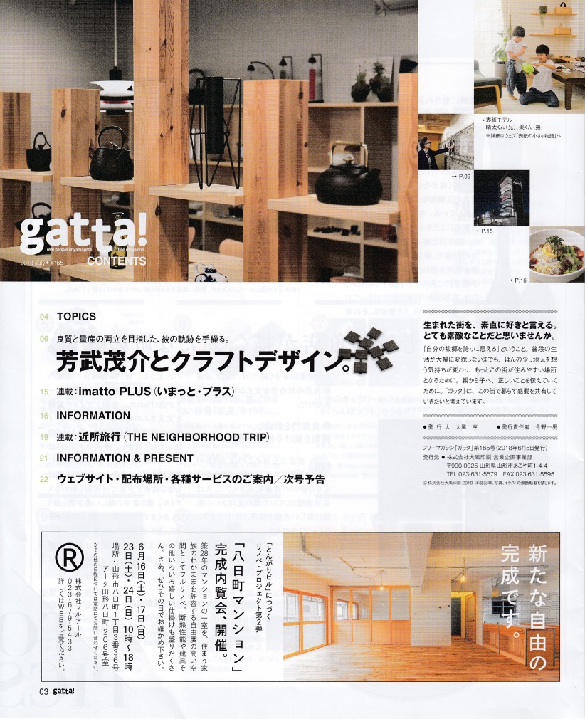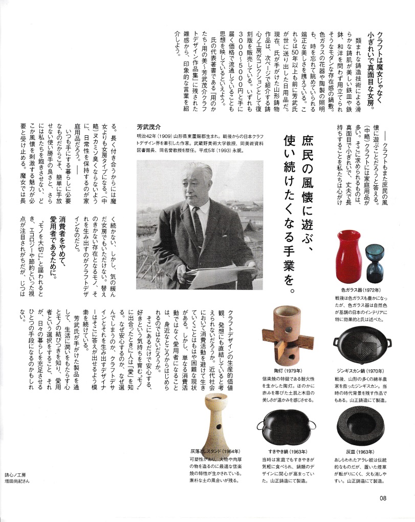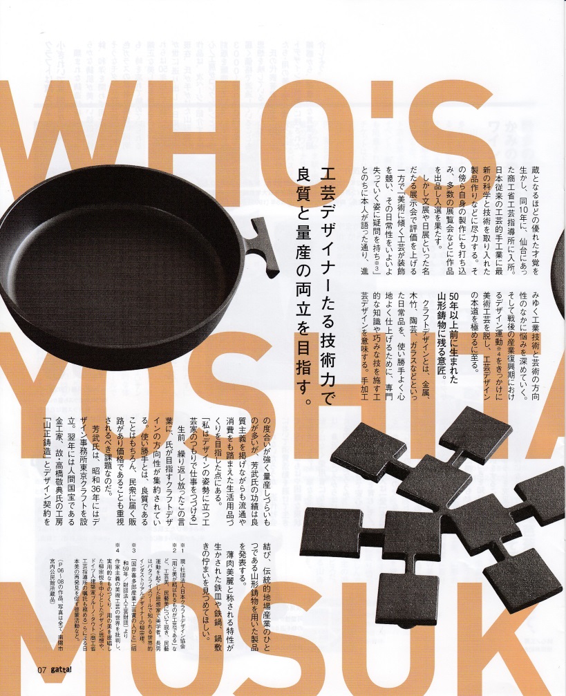 山形のフリーマガジンgatta! vol.165の特集企画で芳武茂介とクラフトデザインが8ページにわたり掲載されました。P9には鋳心ノ工房で復刻した芳武の作品も紹介されています。