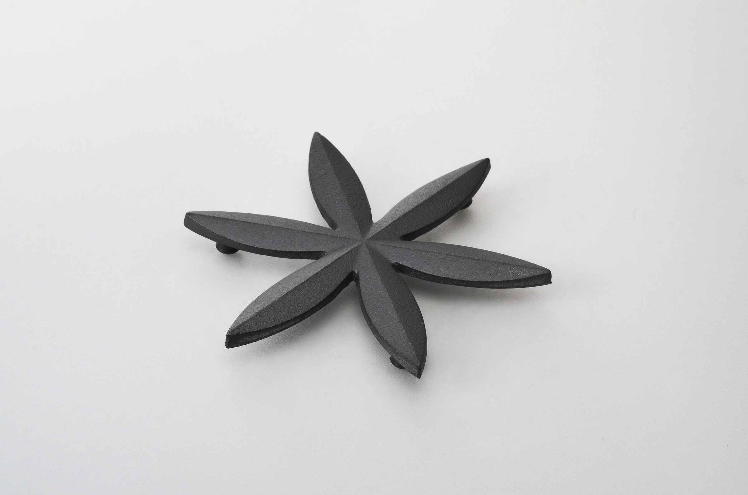 品番:CH-27S 品名:鍋敷・笹車・S色:黒(本漆焼付仕上げ)寸法:135x120x15mm材質:鋳鉄重量:220g価格:3,000円(税抜き)