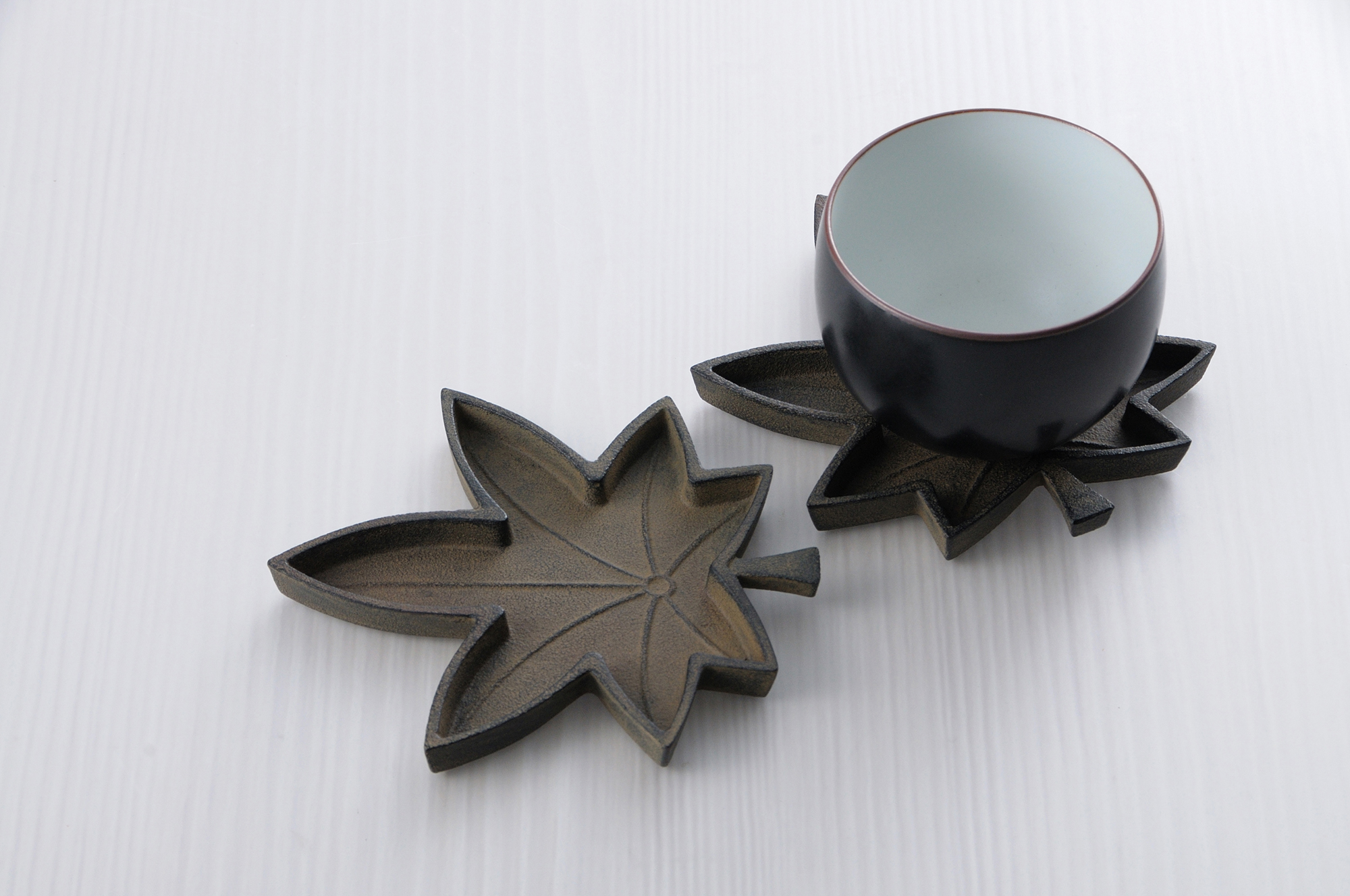 品番:JP-12品名:茶托・楓色:濃茶(本漆焼付仕上げ)寸法:123x113x10mm材質:鋳鉄重量:約220g価格:2,800円(税抜き)