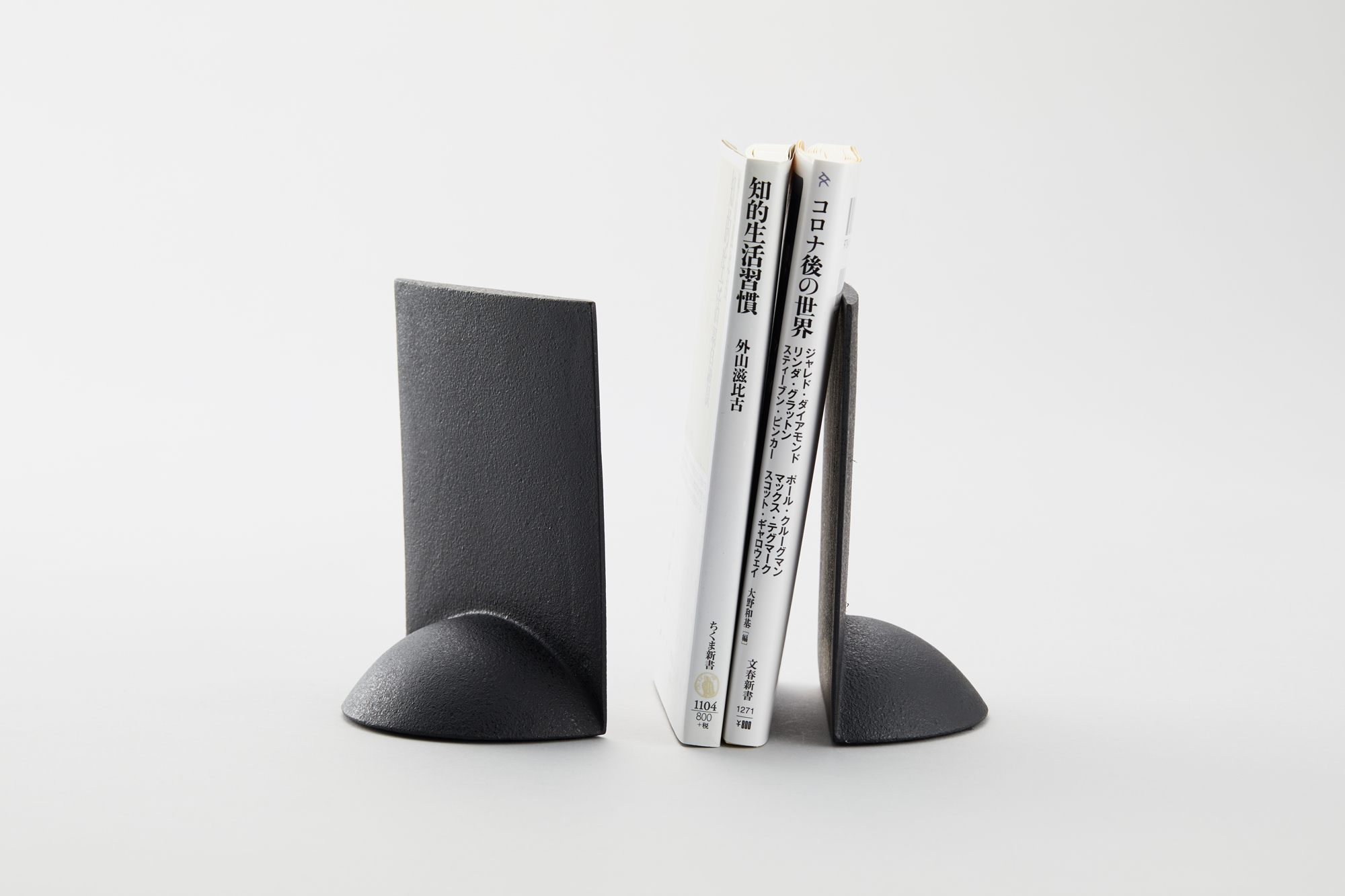 品番:MA-76品名:ブックエンド・曲がり(2個セット)MA-76/Bookends/Mage色:黒(アクリル焼付仕上げ)寸法:130x100x50mm材質:鋳鉄重量:約1,600g仕様:底はフエルト貼り価格:10,000円(税抜き)