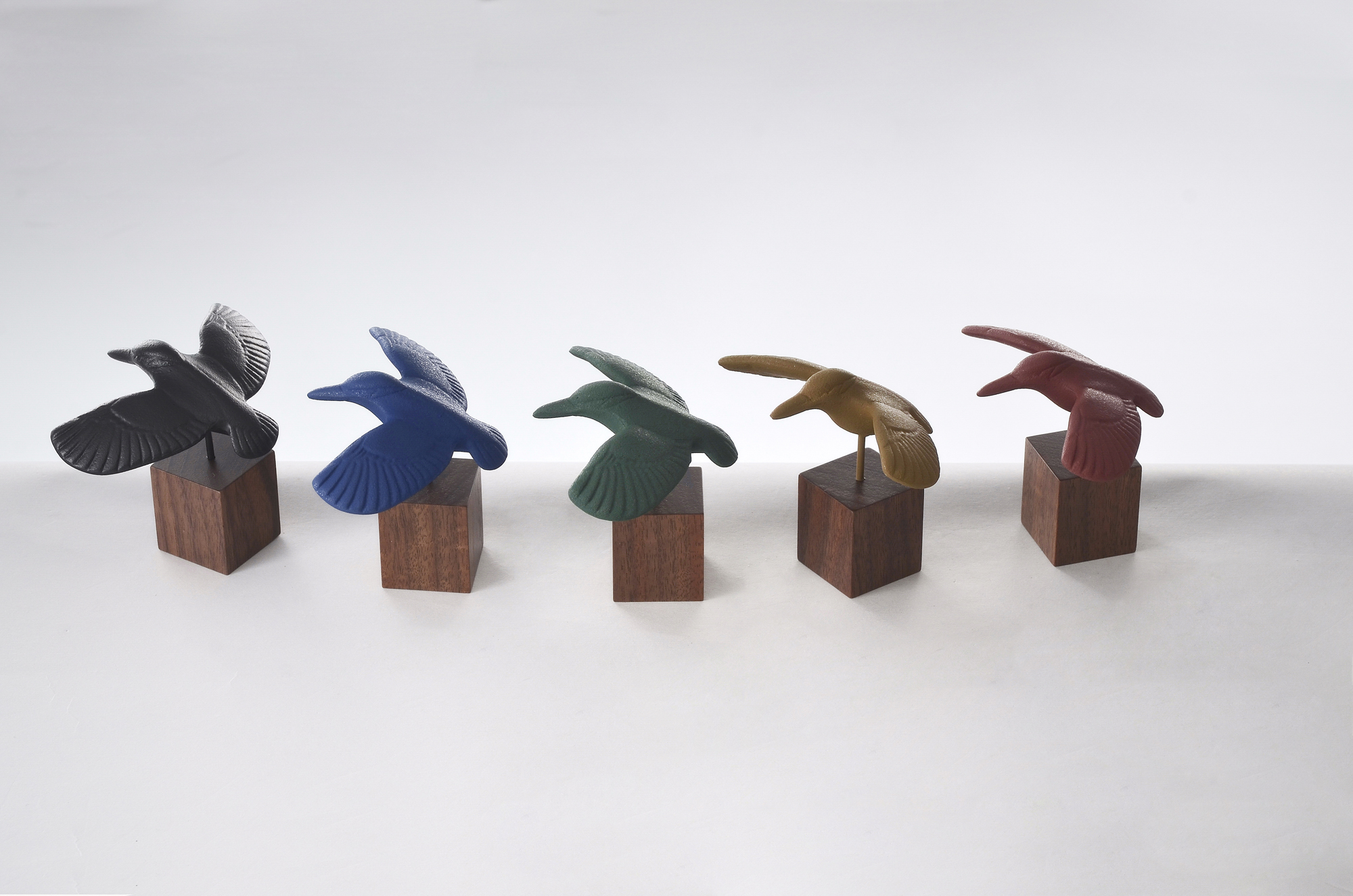 品番:TR-04品名:オーナメント・カワセミ・L色:黒・青・緑・黄・茶寸法:W110xD80xH90mm材質:鋳鉄・木(ウォールナット)重量:約250g価格:5,000円(税抜)