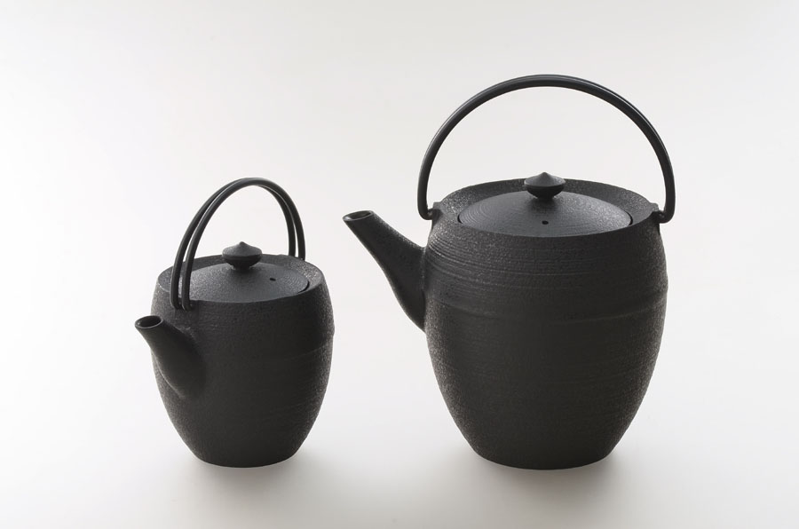 鉄鋳物の本体と鉄の鋼材のハンドルとの組合せのティポット。茶入れの棗をイメージしたデザイン。本体の黒色とハンドルの黒との調和が美しいデザイン。鉄鋳物は保温力が大きいので、冷めにくくティポットには最適な素材。内側は錆びを防ぐためホーロー加工を施しています。使いやすさを重視し、ハンドルが両側に開き、内部の手入れがしやすい仕組みにデザインされています。サイズは大小2種類、1.1L,0.45L。伝統工芸を現代のライフスタイルに提案するシリーズです。