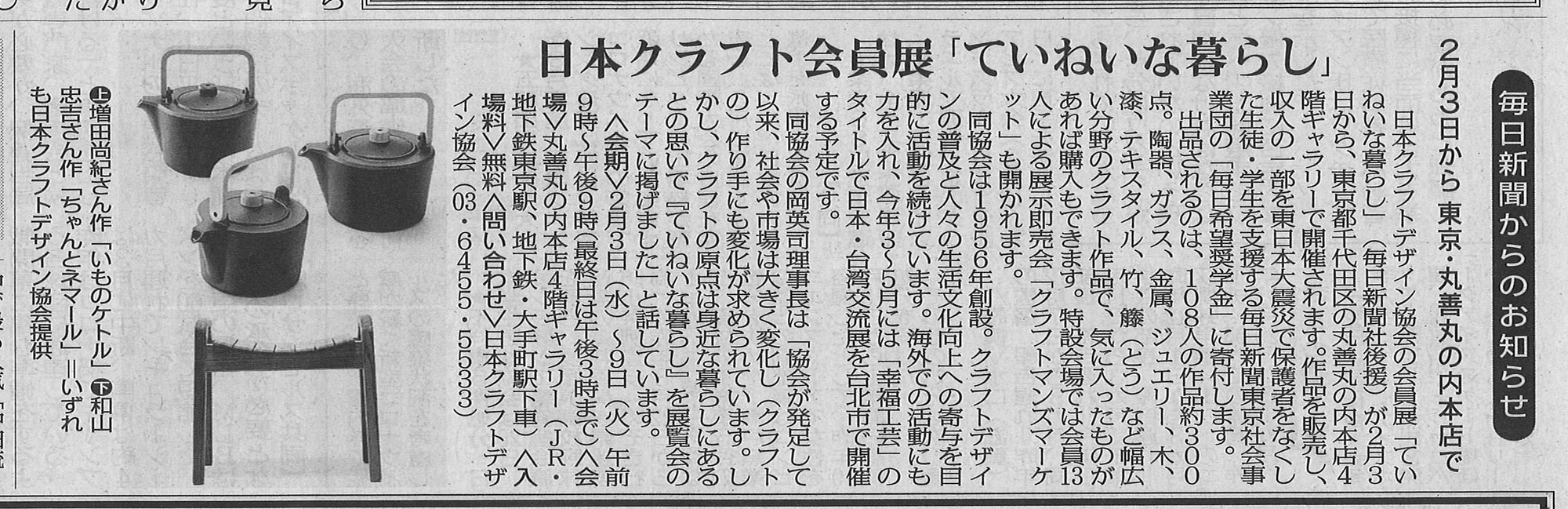 日本クラフトデザイン協会は、クラフト分野で唯一の公益社団法人です。日本各地で活躍する会員は、陶磁、ガラス、金属、ジュエリー、木、漆、テキスタイル、竹、藤など幅広い素材と分野で作品を作り続けています。私たちはこの1年間、新型コロナウィルス感染症の影響もあり、大切な「もの」や「こと」を改めて考えました。今こそ、身近な人たちとの日々を丁寧に過ごすために、作家が心を込めて生み出したクラフト作品の出番です。作家の手から使い手である皆様の手へ。協会108名の作家による「ていねいな暮らし」の道具をご覧ください。なお、この展覧会の売り上げの一部を「毎日希望奨学金」に寄付します。